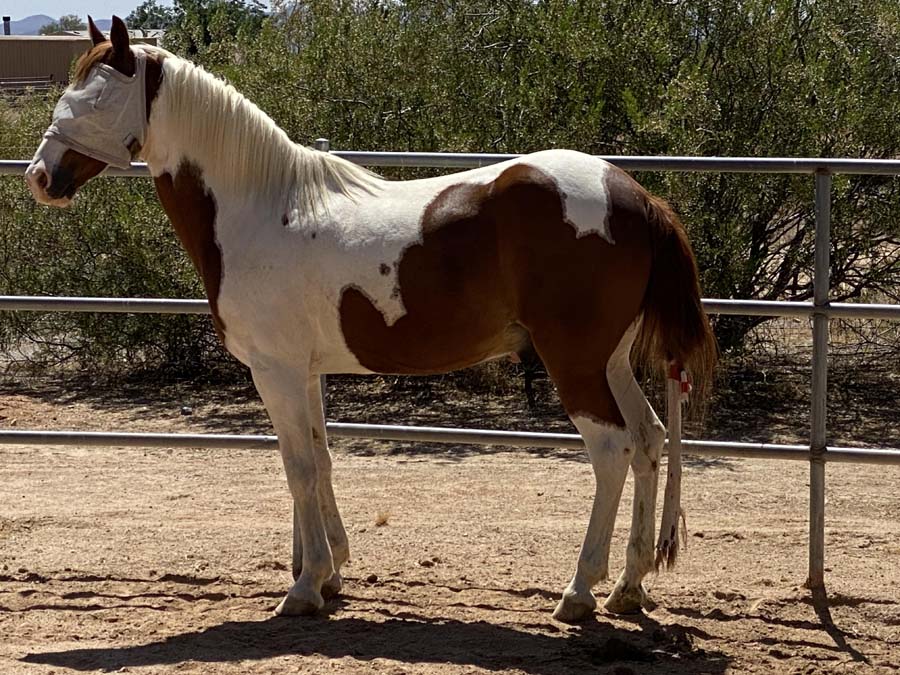 The overo pattern includes irregular white markings that are ‘framed’ by a base color but do not extend over the back. Interestingly, my horse is heterochromic—one blue, or “glass,” eye and one brown eye—which is sometimes seen in overo horses. Fortunately, for skin cancer concerns, both eyes are encased in brown skin.
