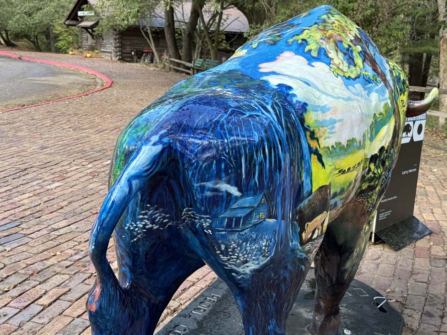 However, populations of bison are being reestablished , including the herd at the Prairie View Wildlife Park. The park took part in the bison-tennial, creating a bison sculpture named Buddy. Buddy features scenes of Native Americans of the Peoria Nation and early settlers, and is also adorned with local animals.