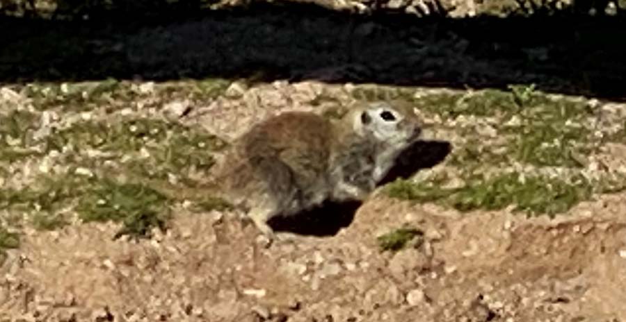 The “little prairie dogs” in my yard were actually Round-tailed Ground Squirrels (Xerospermophilus tereticaudus). They spend their days digging through my yard, leaving piles of loose dirt—an impressive feat considering our ground is hard-packed sand and caliche (a cement-like substrate). Plants struggle to break through caliche, but these squirrels have no problem!