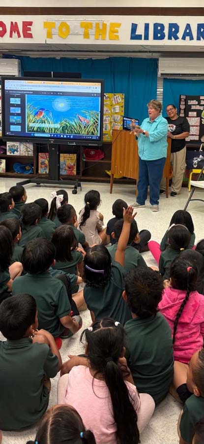 Ms. Powers’ rhyming picture book tells the story of the environmental damage caused by the invasive brown treesnake and is uniquely written in both English and CHamoru, the endangered language of Guam. During her school visits, students gathered in classrooms, libraries, and cafeterias, and also joined via videoconferencing. The book was shared in both languages, with Powers reading the English text while alternating with CHamoru speakers, including teachers, students, and the book’s original translators. The tour also provided Powers with the opportunity to meet one of the book’s Guam-based illustrators.